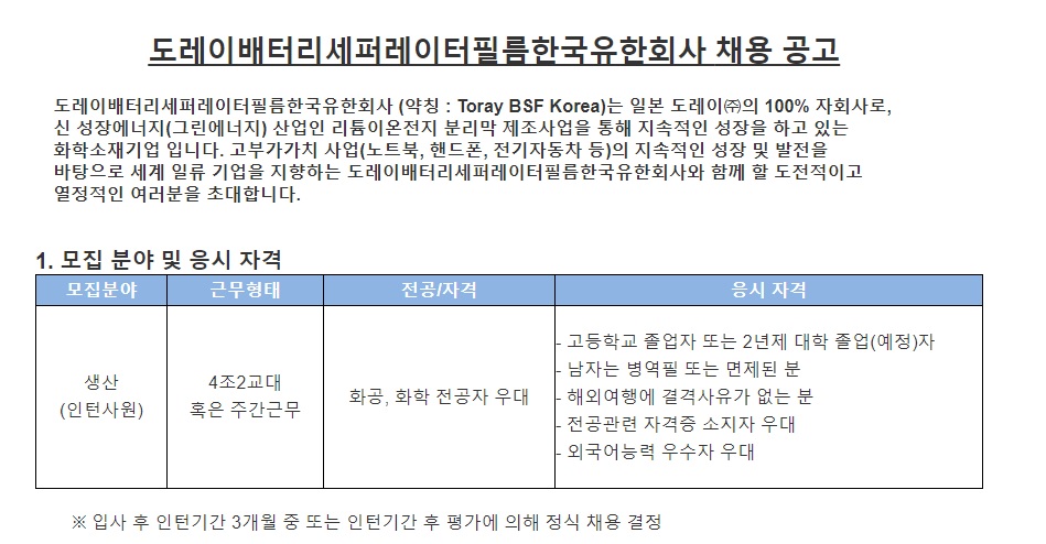 인턴 기간 3개월 화학 전공자를 좀더 우대해서 뽑는거같음