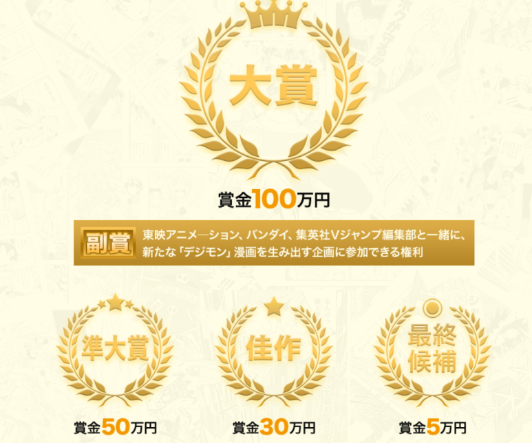1등은 100만 엔이 수여될 뿐만 아니라 새로운 만회 기획에 참여할 권리 또한 부여해 주면서 또한 현재 디지몬 만화 쪽의 팀 분들이 수상자 잡지 연재를 목표로 서포트도 해준다고 합니다.